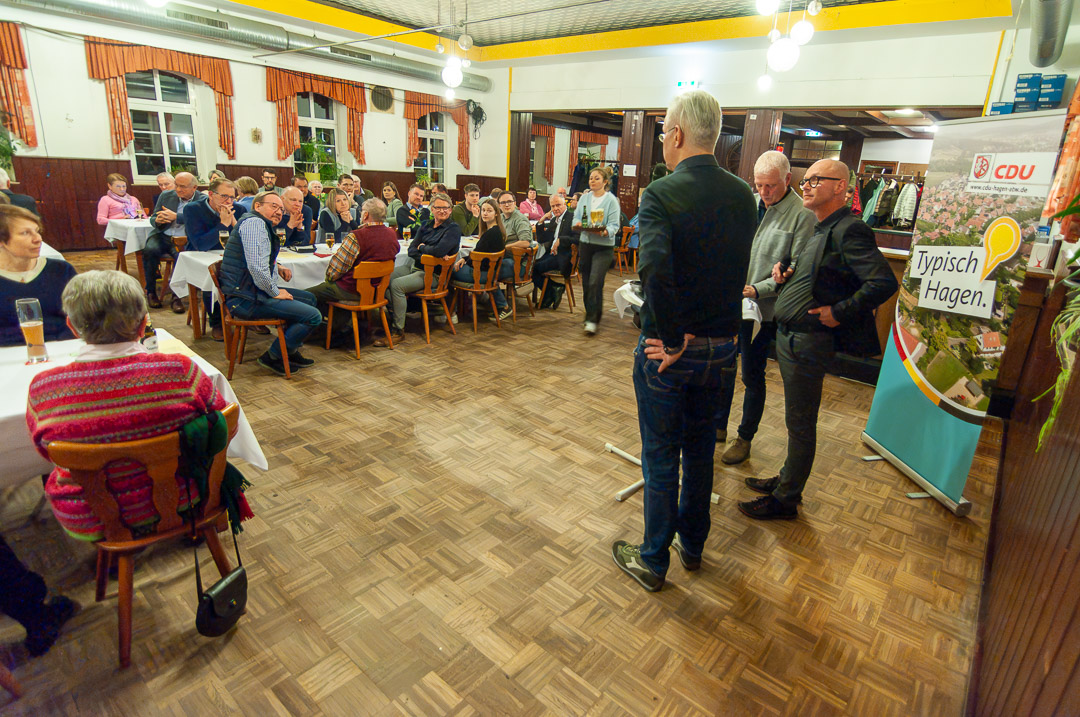 „In der Tat mussten wir in den letzten Tagen eine Reihe von krankheitsbedingten Absagen entgegennehmen, aber das soll der Stimmung am heutigen Abend keinen Abbruch tun“, begrüßte Summe die Anwesenden auf dem Saal der Gaststätte Stock. Der Einladung der Hagener CDU waren neben den lokalen CDU-Mitgliedern zahlreiche Vertreterinnen und Vertreter der Hagener Vereine und Verbände gefolgt und selbstverständlich fehlte auch Hagens Bürgermeisterin Christine Möller nicht.